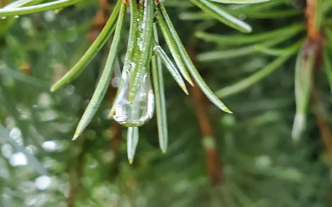 As we walked and talked, we started to notice the water droplets – not quite frozen but definitely sluggish – hanging off twigs, glittering in the subtle low light.